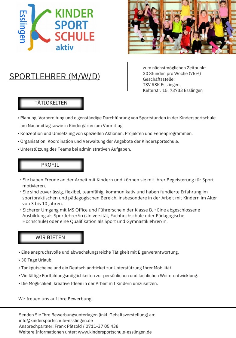 Die Kindersportschule Esslingen sucht zur Verstärkung unseres Teams