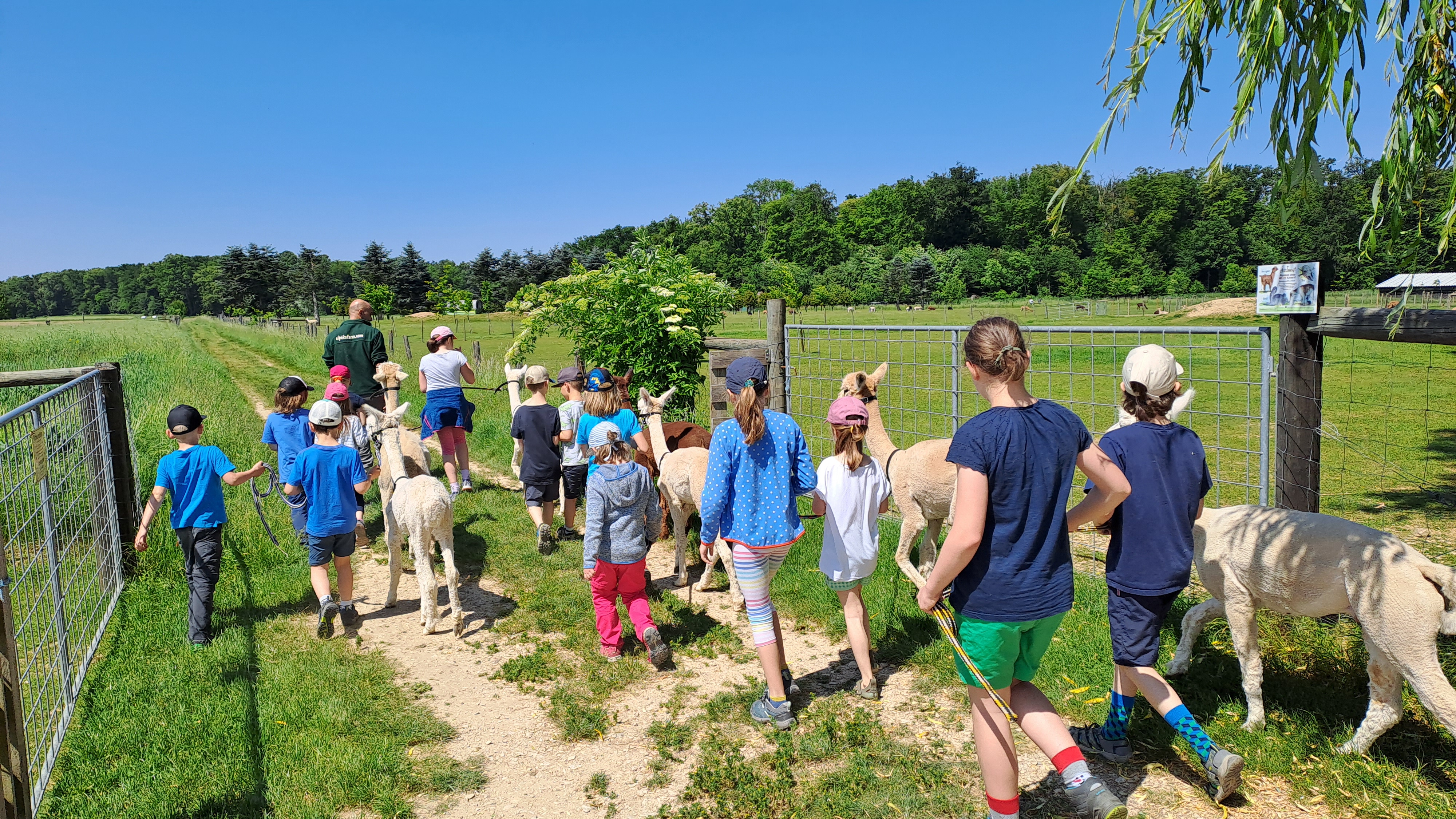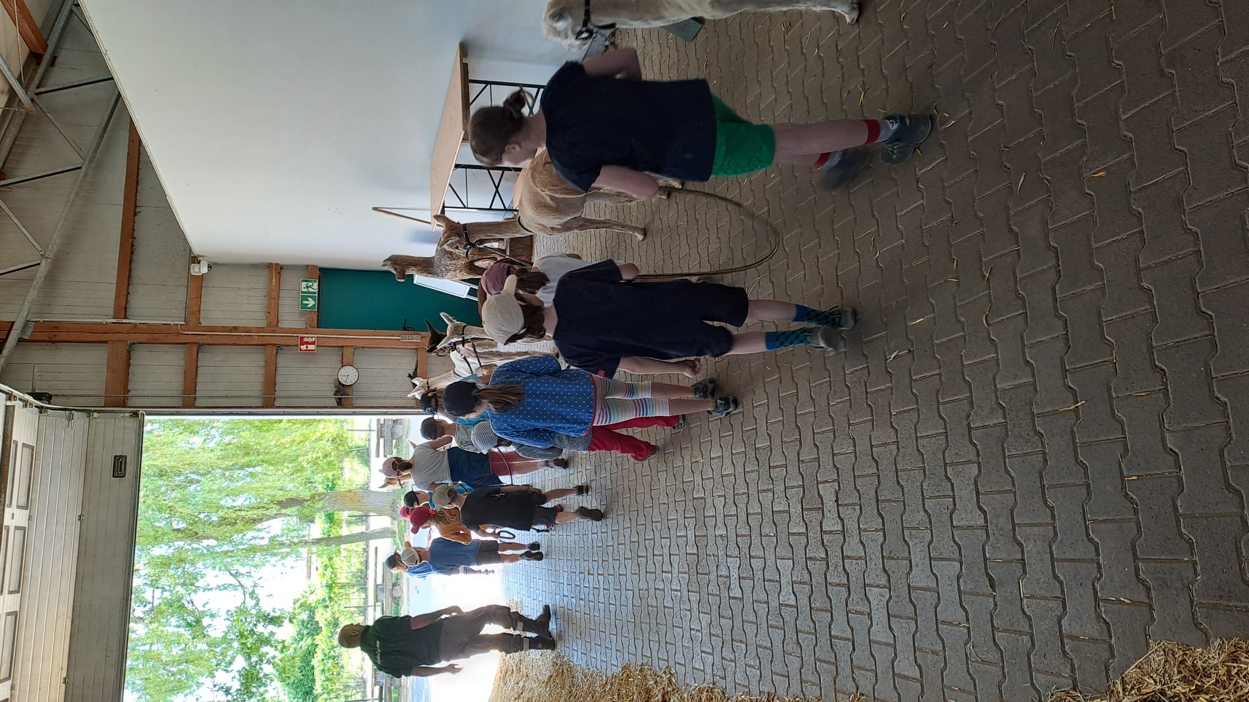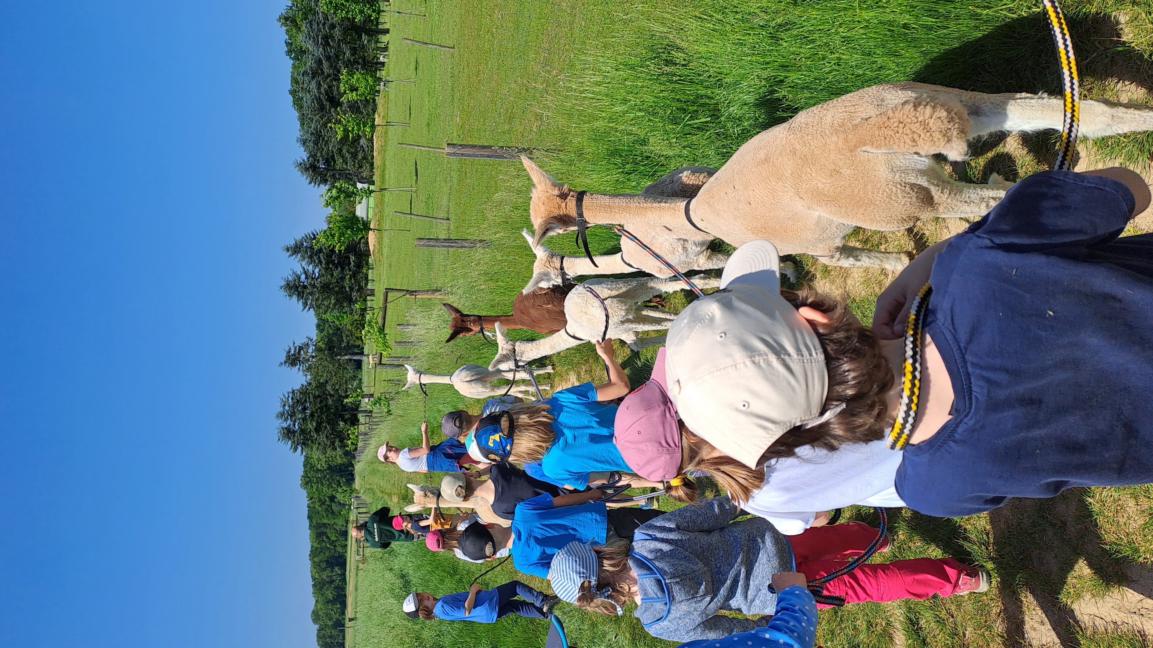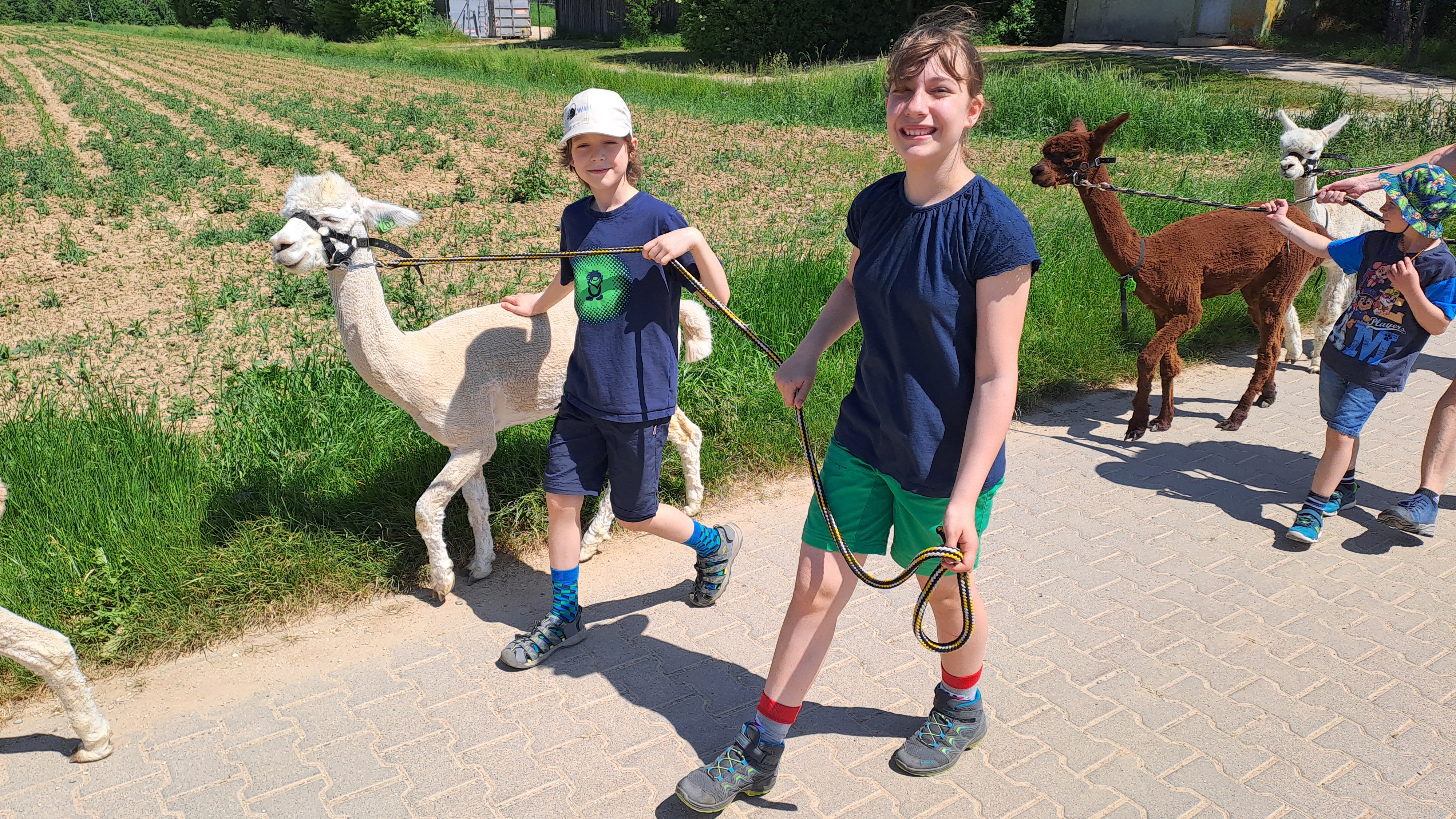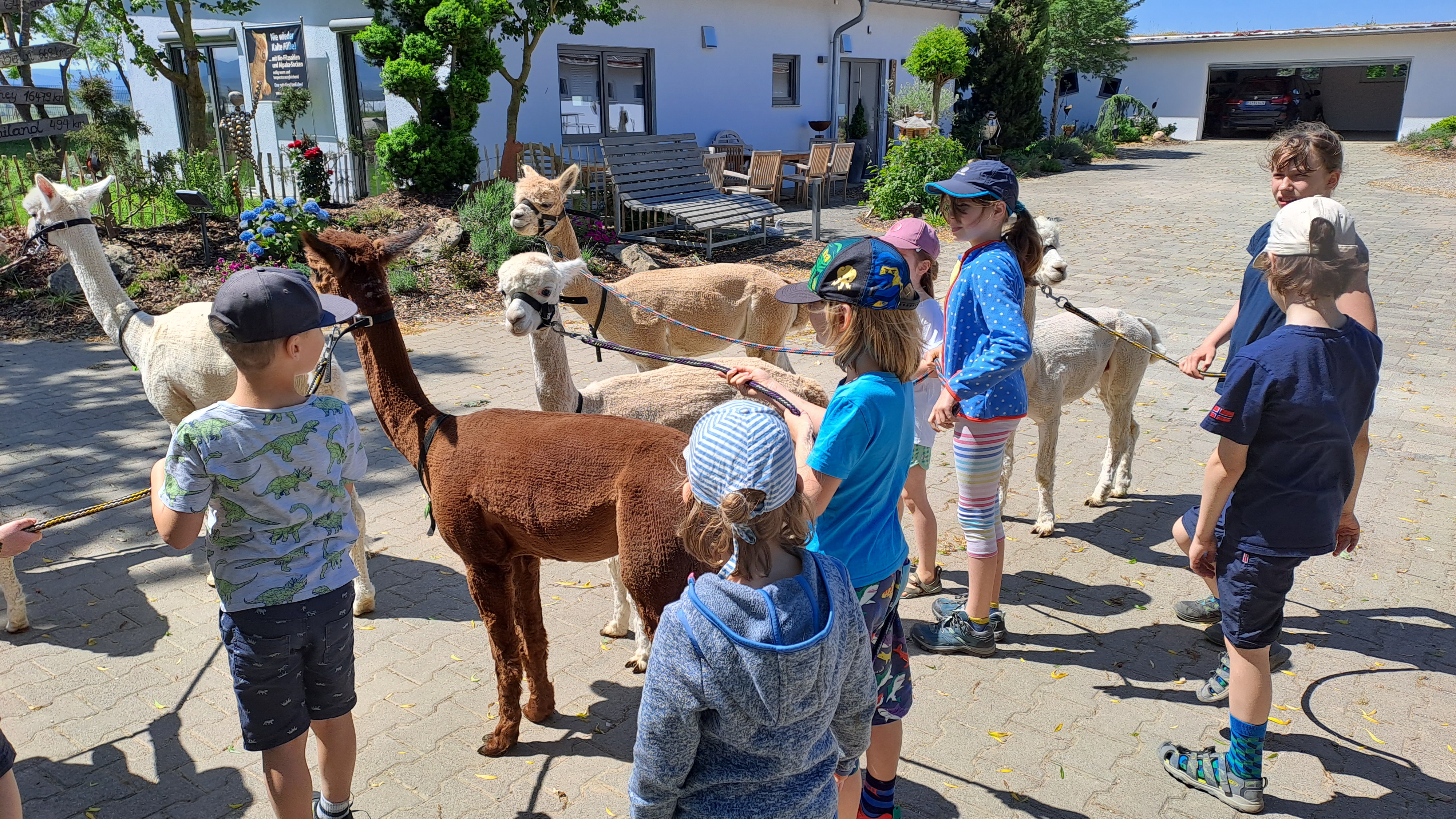 Nach Vesper und Begrüßung auf der Farm waren wir mit den Alpakas auf einer kleinen Alpakatrekkingtour, immer 2 Kinder hatten ein Alpaka am Halfter und durften es führen. Zurück im Stall erfuhren wir einiges über die Haltung, Fütterung, Pflege und Wollverarbeitung. Anschließend durften wir uns noch in der Strohhüpfburg austoben.