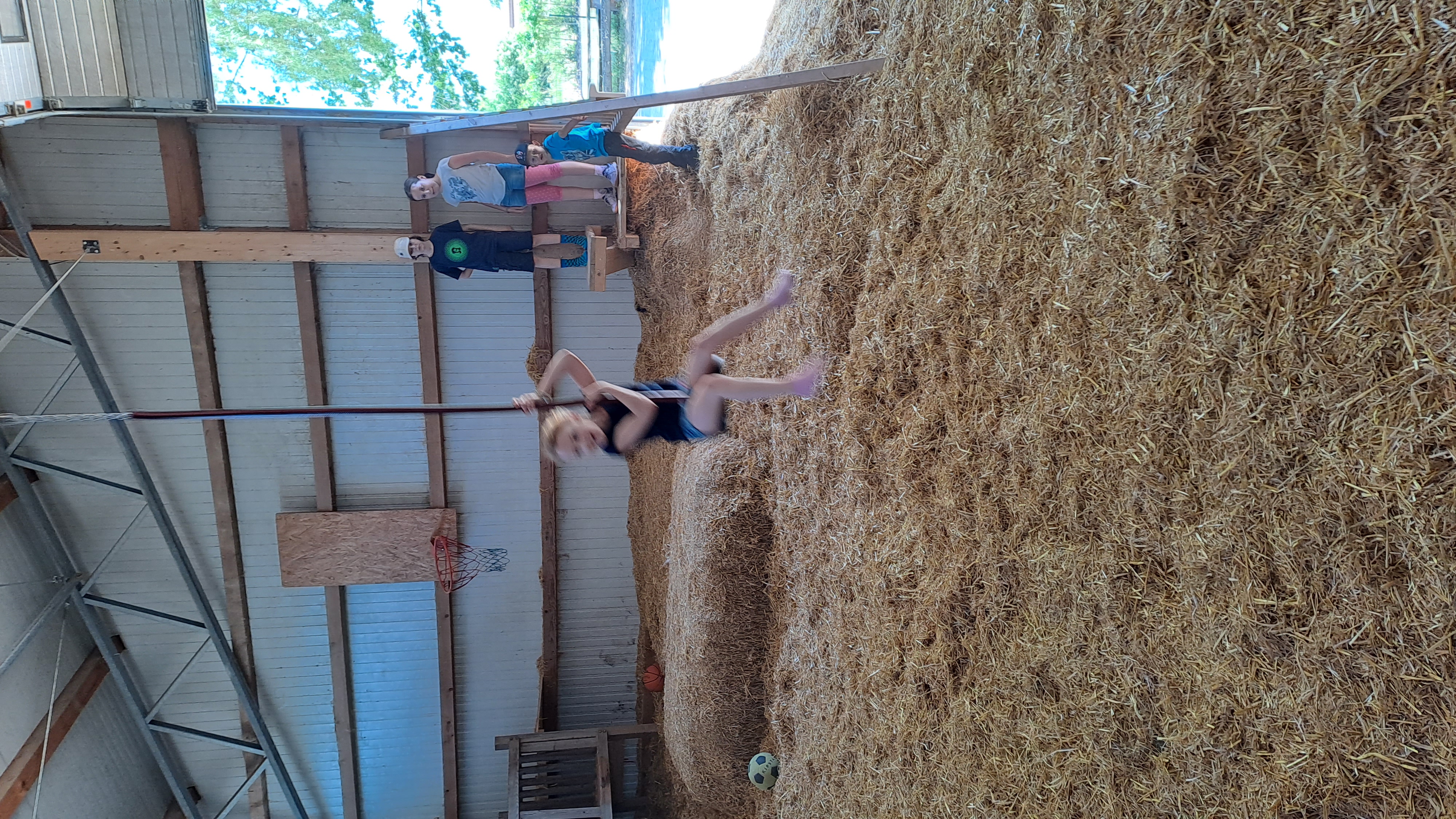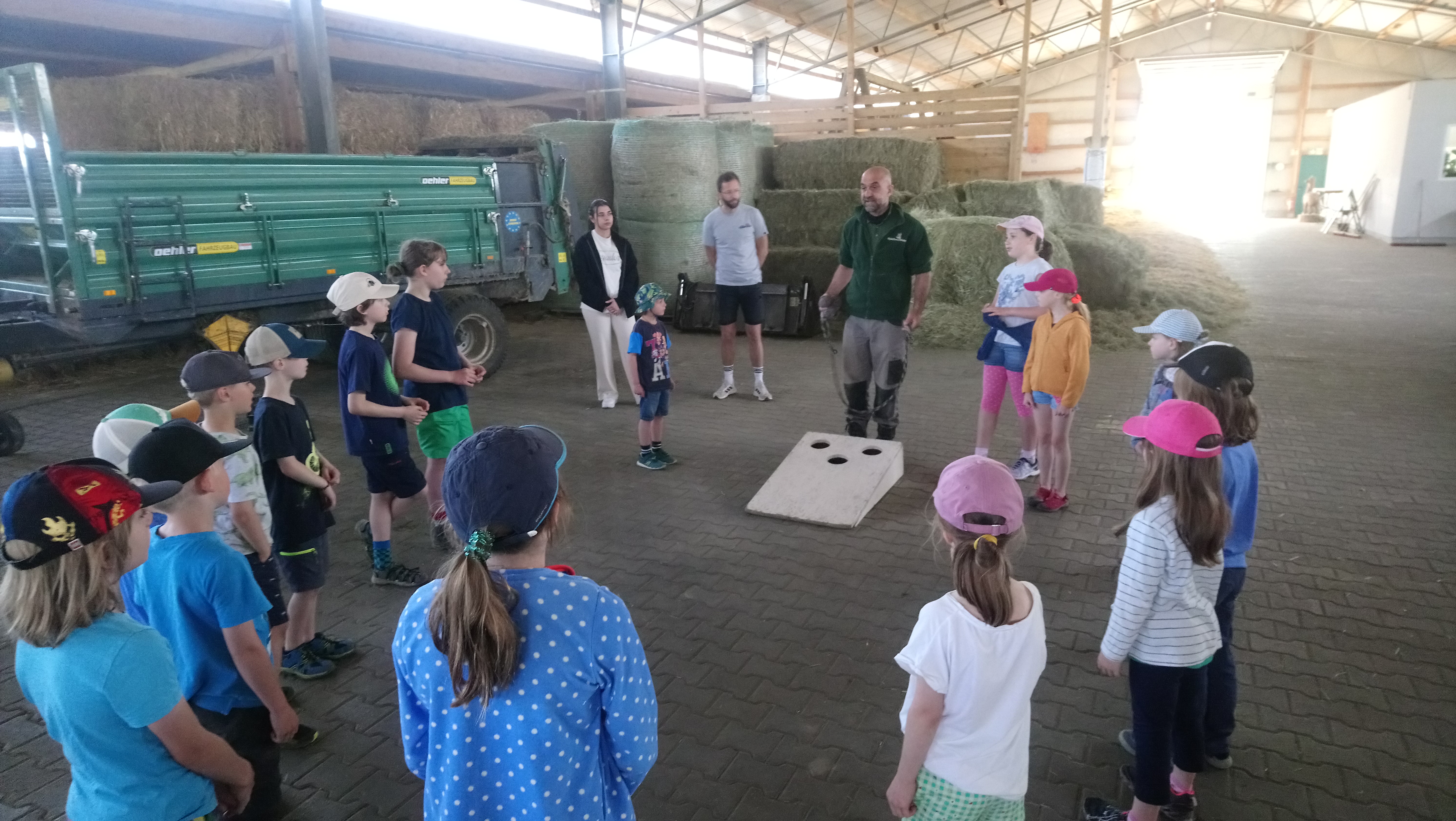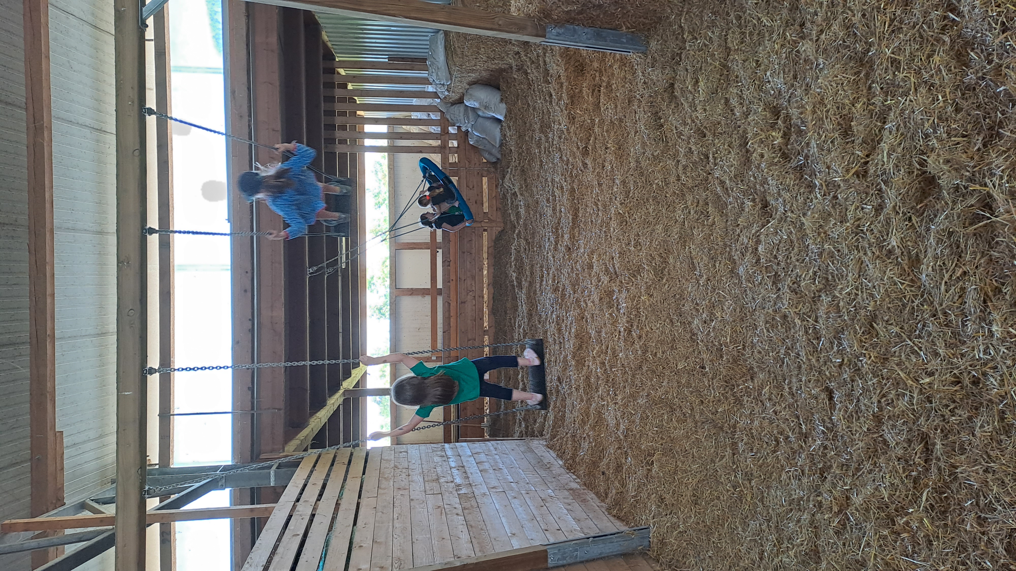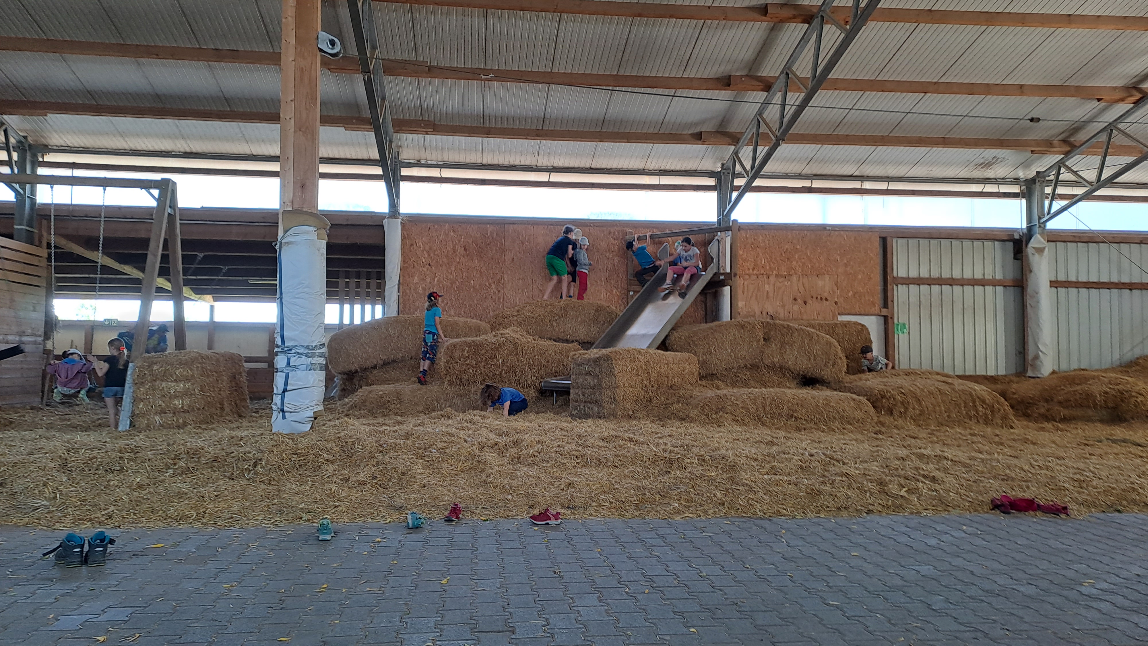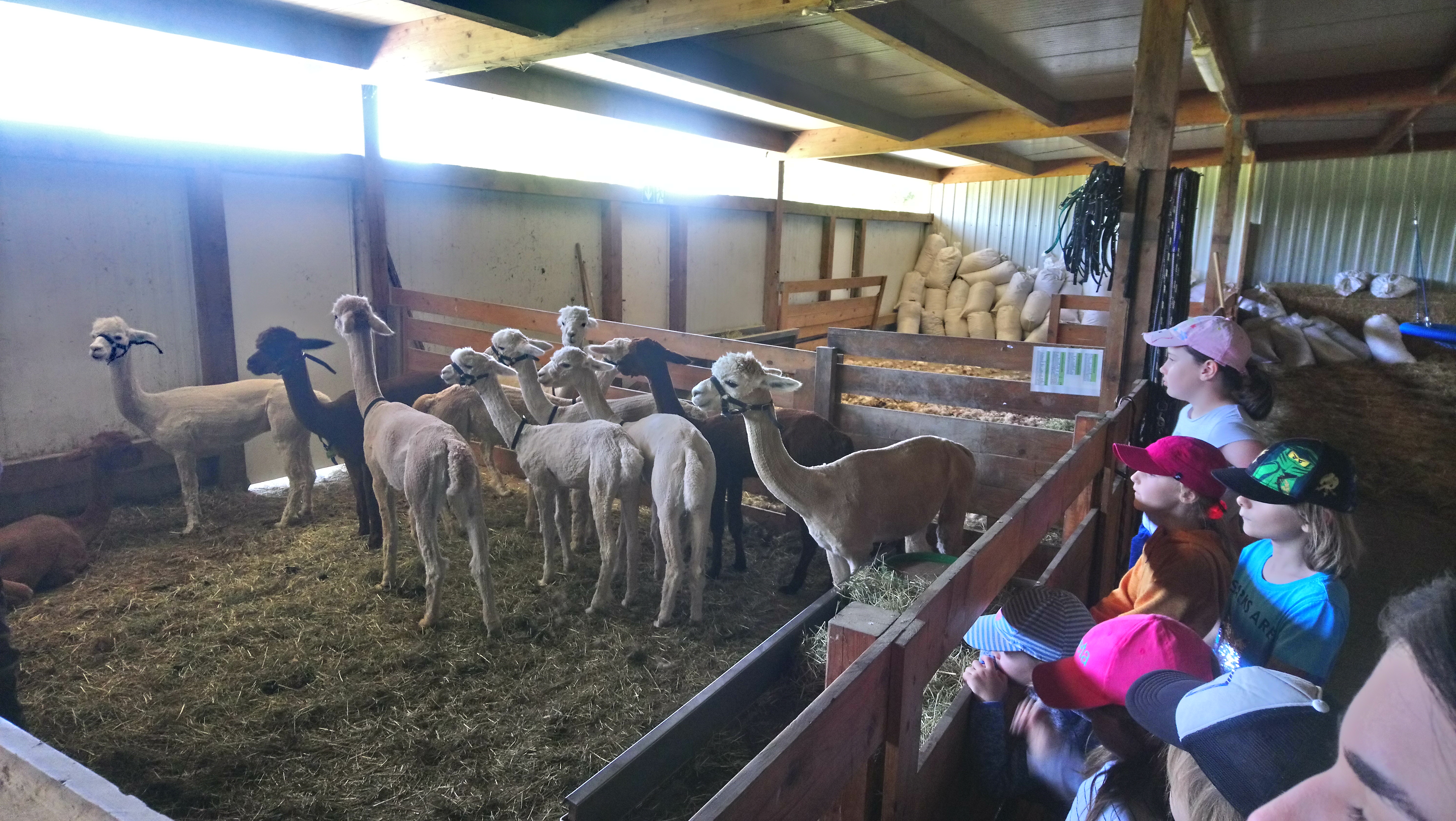 Nach Vesper und Begrüßung auf der Farm waren wir mit den Alpakas auf einer kleinen Alpakatrekkingtour, immer 2 Kinder hatten ein Alpaka am Halfter und durften es führen. Zurück im Stall erfuhren wir einiges über die Haltung, Fütterung, Pflege und Wollverarbeitung. Anschließend durften wir uns noch in der Strohhüpfburg austoben.