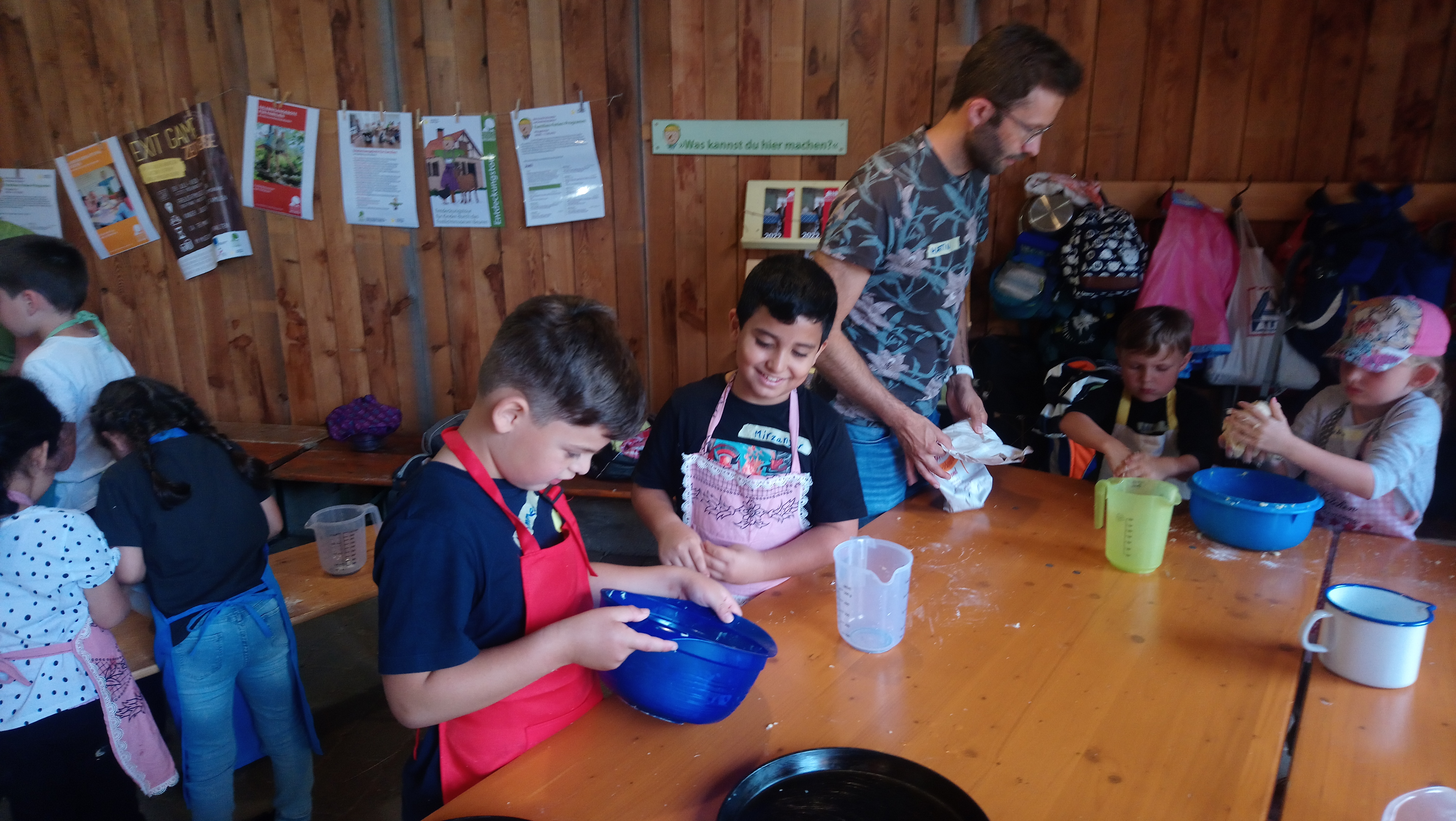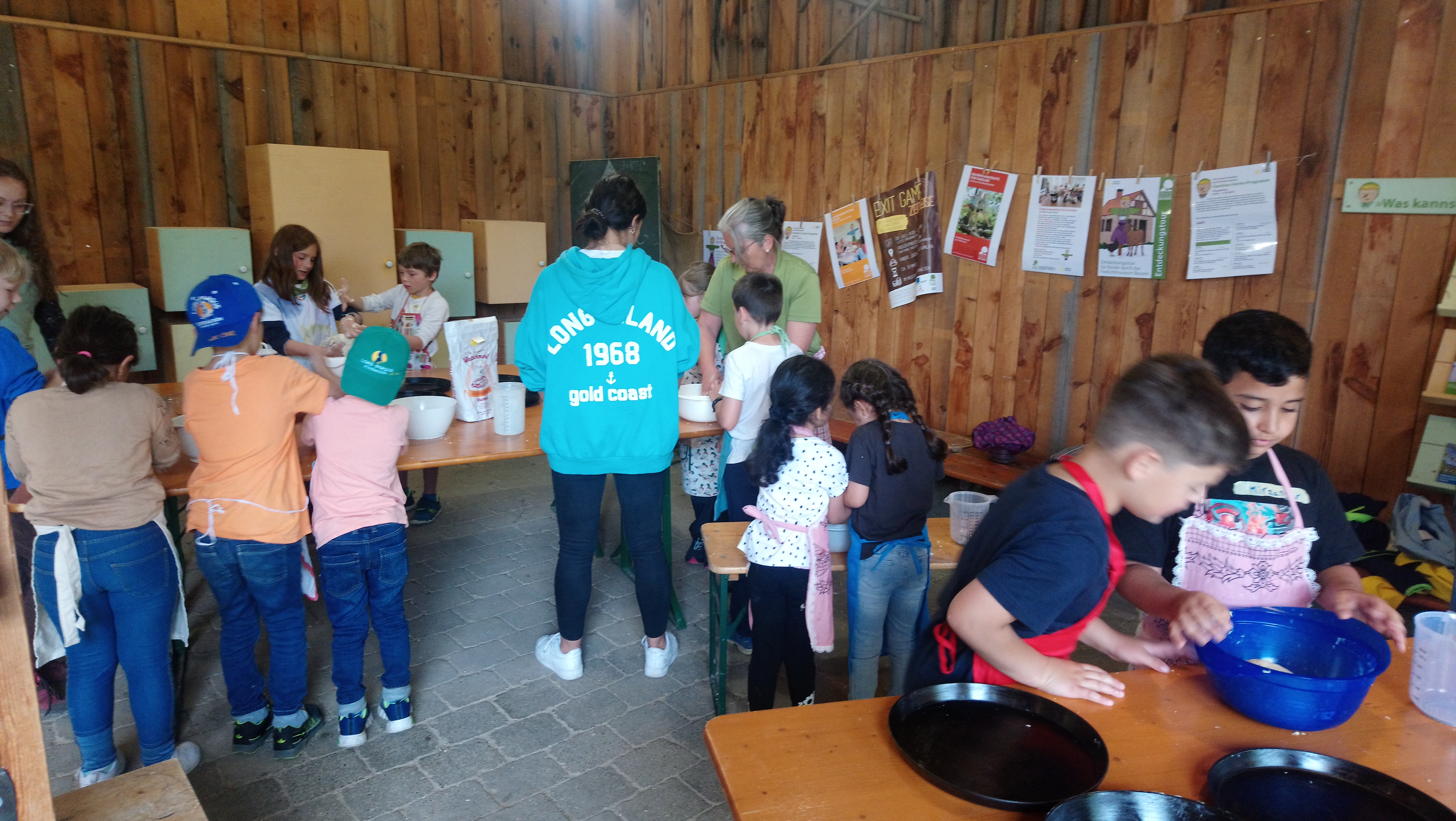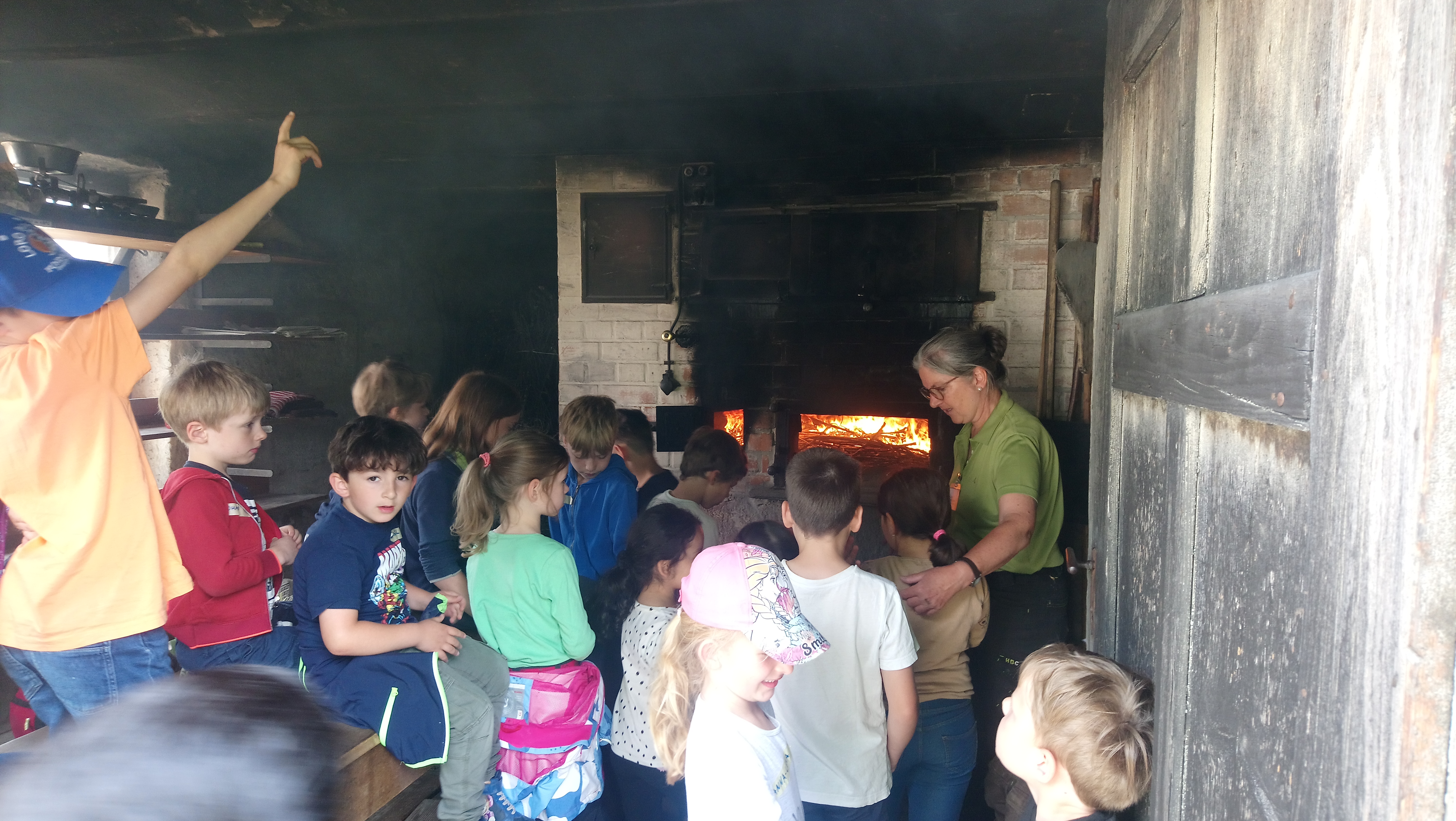 Bei dieser Aktion durften die Kinder in einem mehr als 100 Jahre alten Backhaus unter fachkundiger Anleitung backen. Die Kinder heizen den Holzbackofen ein, bereiten gemeinsam den Teig für die Brötchen vor und treffen die Vorbereitungen zum Einschießen der Brötchen in den heißen Backofen. Dabei lernen sie Arbeitsgeräte wie Ascheschieber (schwäbisch „Kruck“), Hudelwisch und Backschießer kennen. Mit der „Zeitungsknäul-Methode“ testen sie die Backtemperatur des Holzbackofens und erfahren was es mit dem Spruch „Nur net hudle“ auf sich hat...