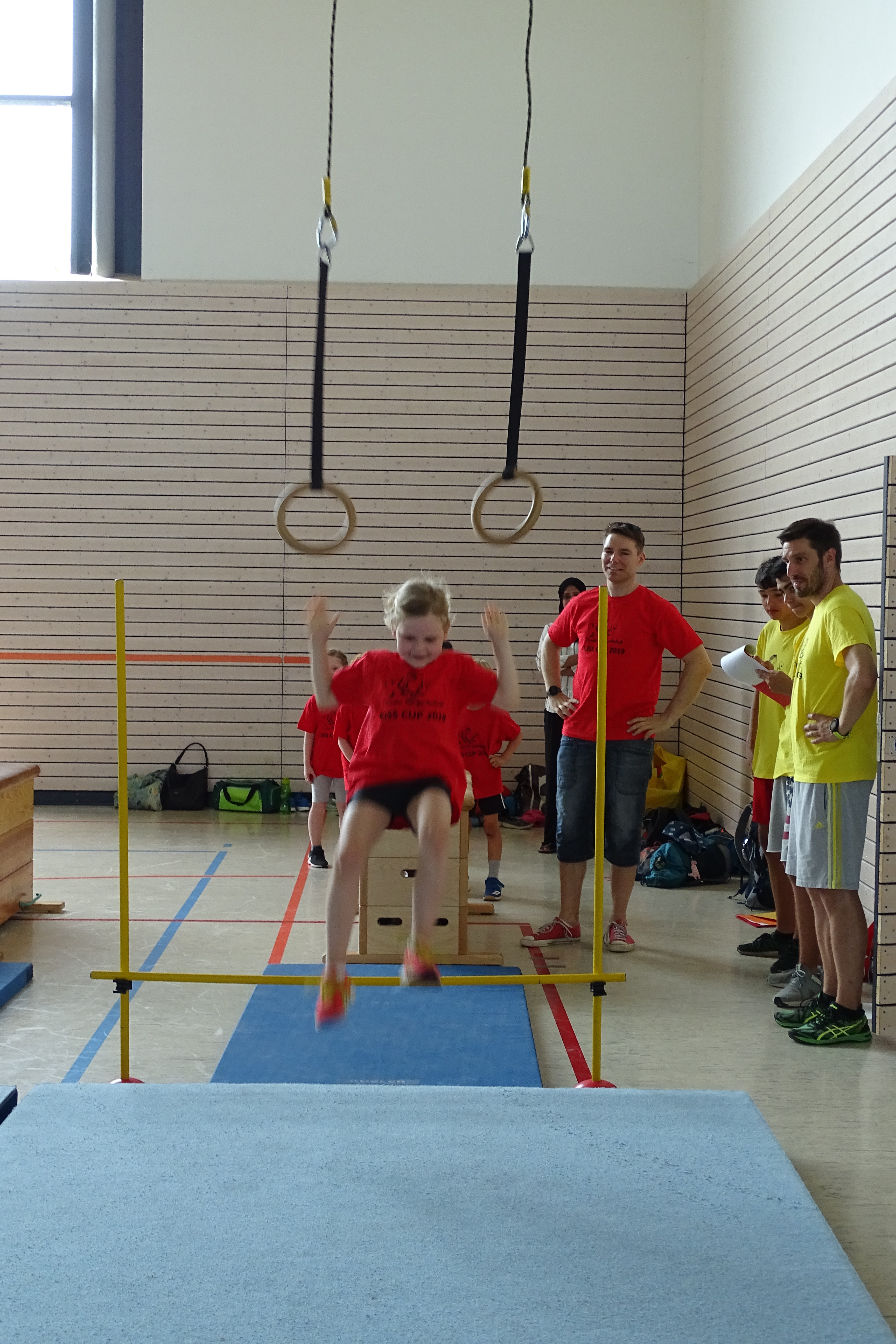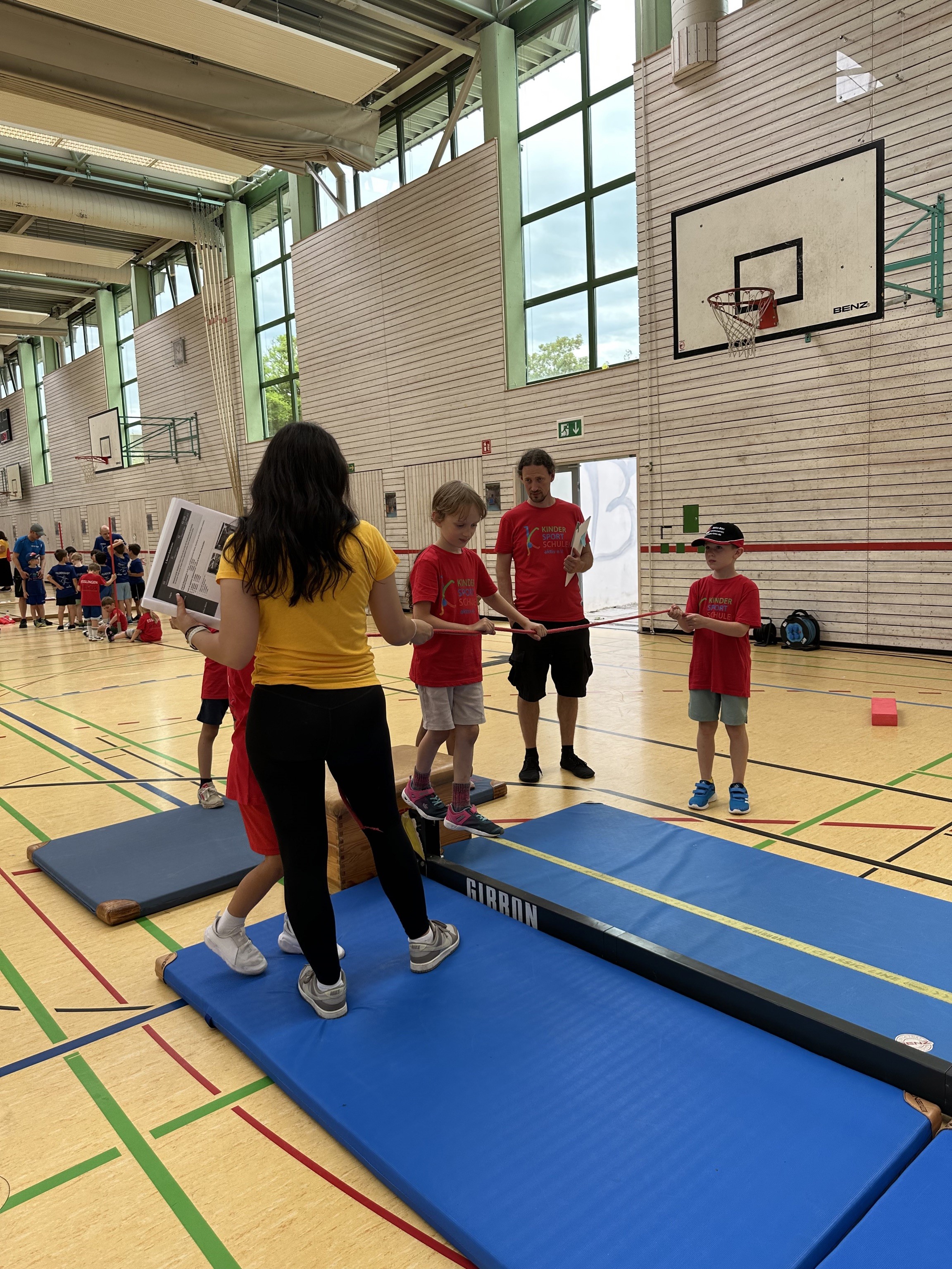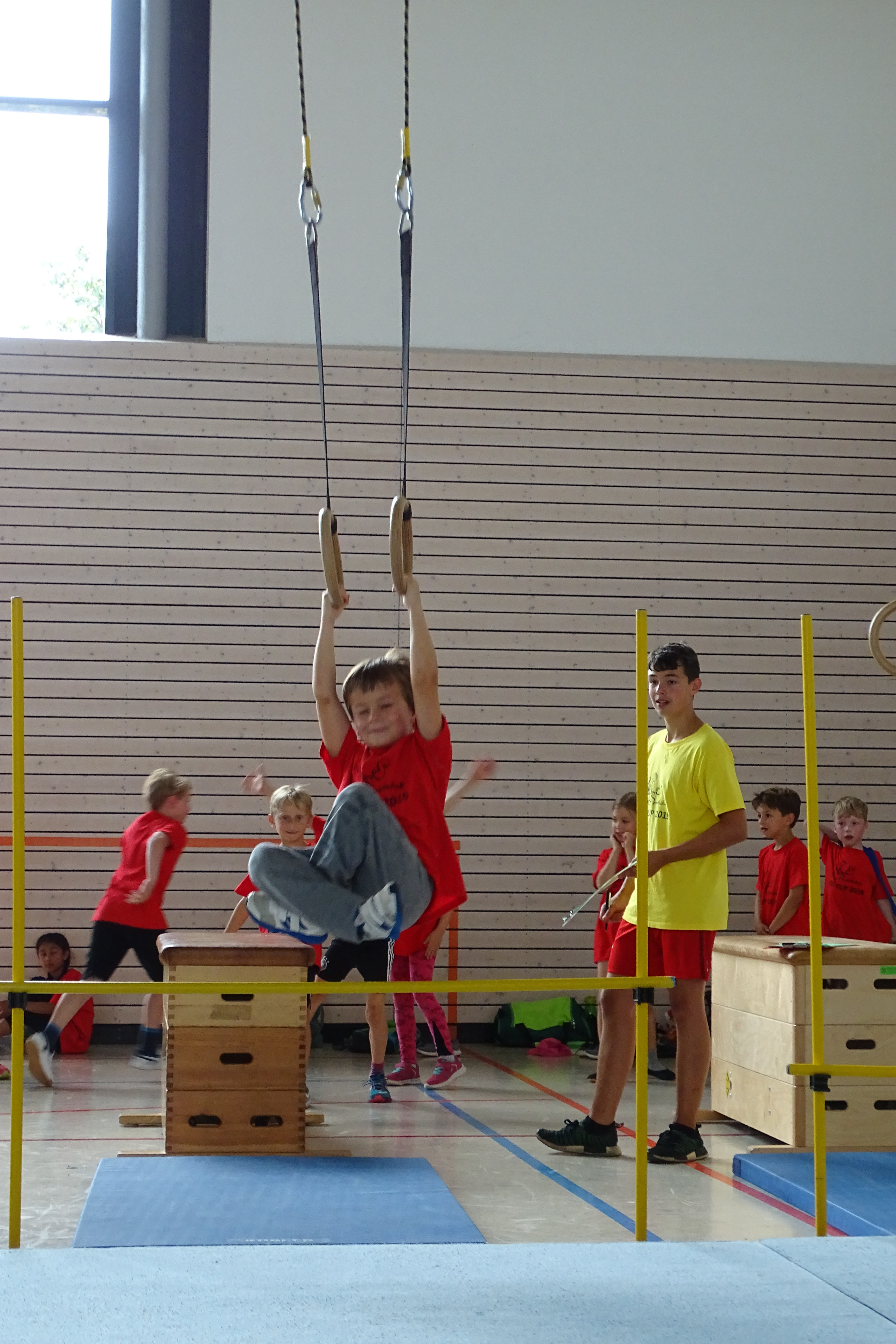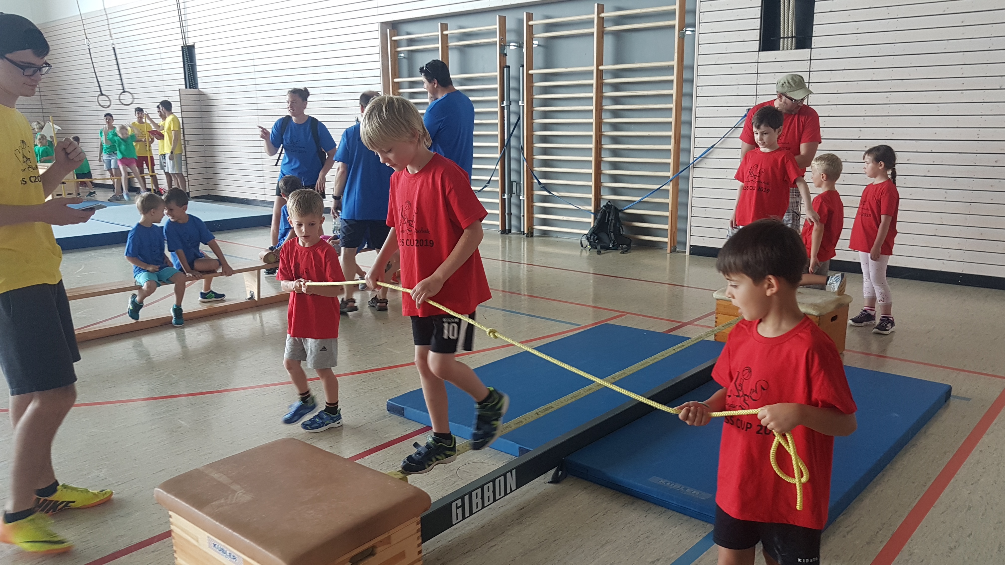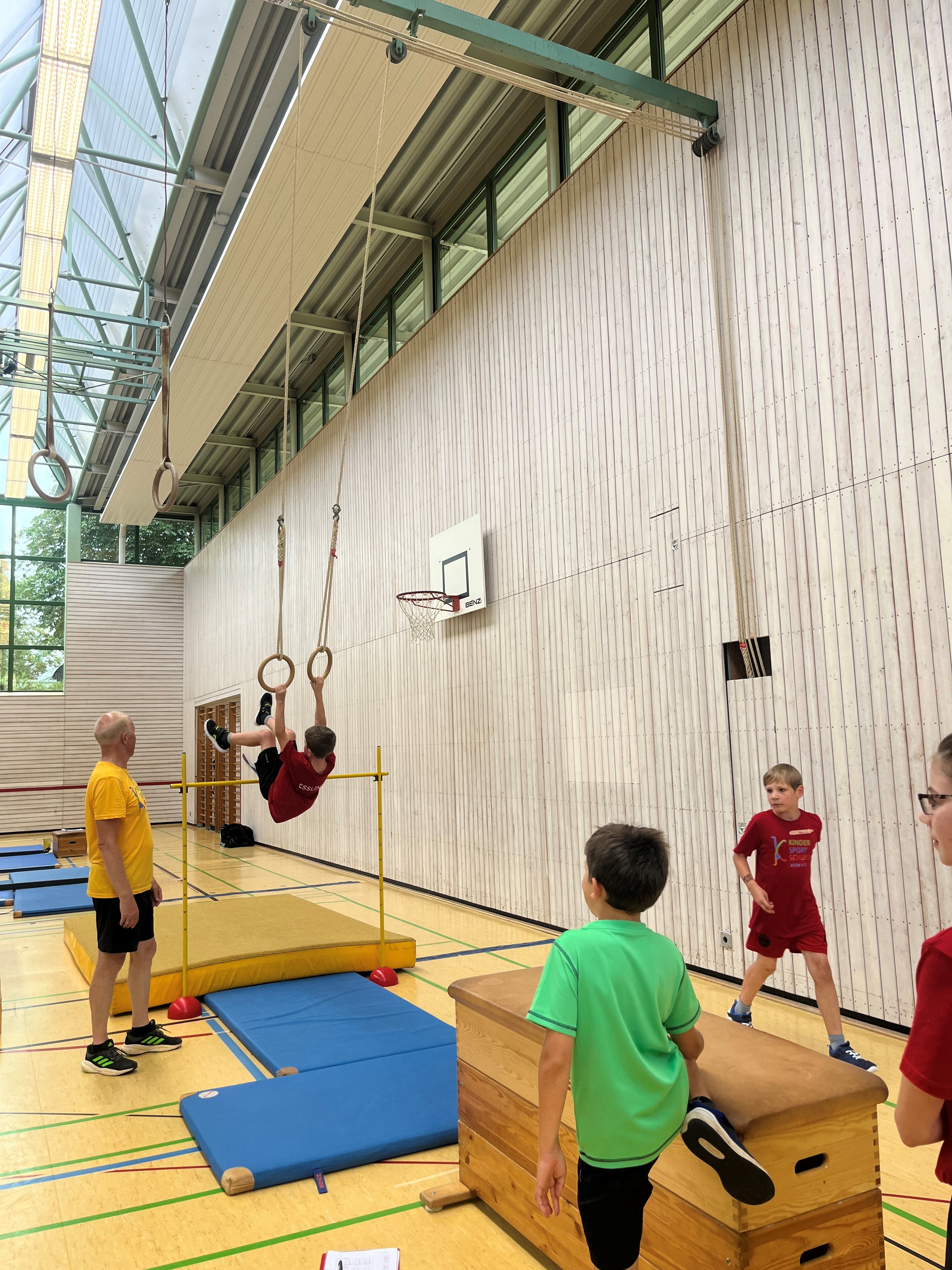Schwingen mit Ringen über ein Hindernis, Erklimmen eines Mattenbergs, Turnen am Boden, Rhythmisierungsläufe, ein Hüpfdiktat, ein Ballparcours, Trampolinspringen, Balancieren über die Slackline.. viele verschiedene Aufgaben waren zu absolvieren.