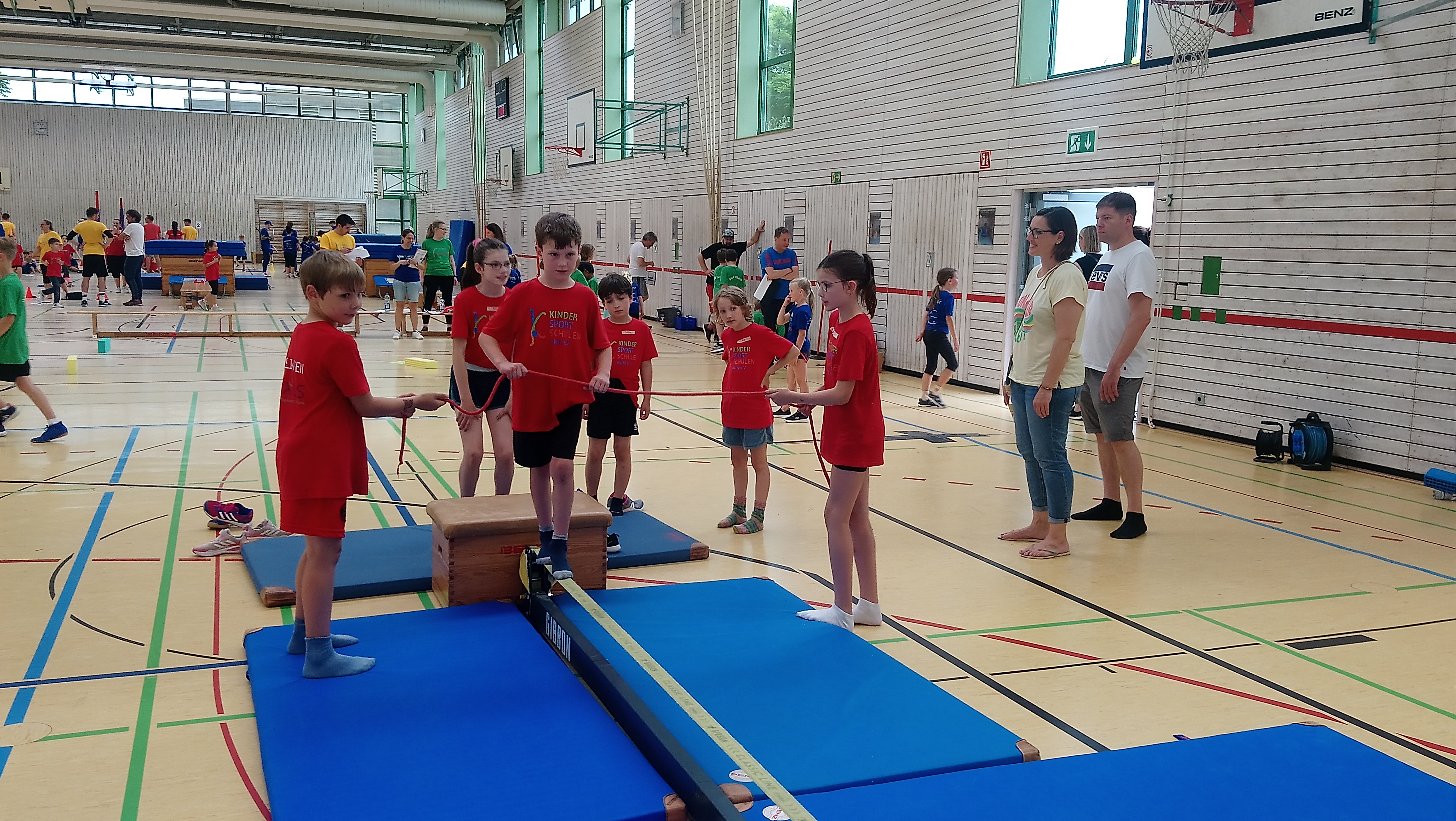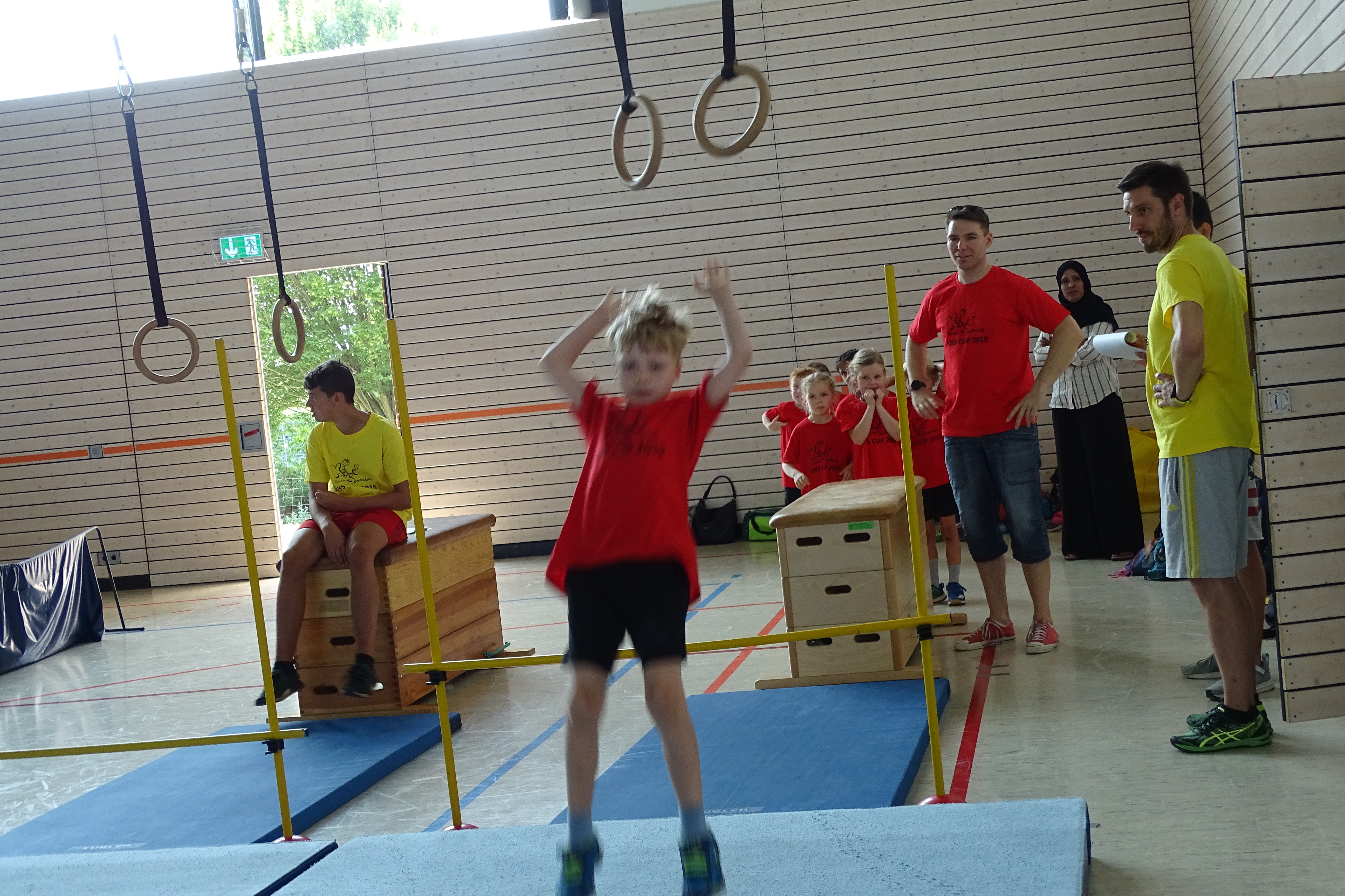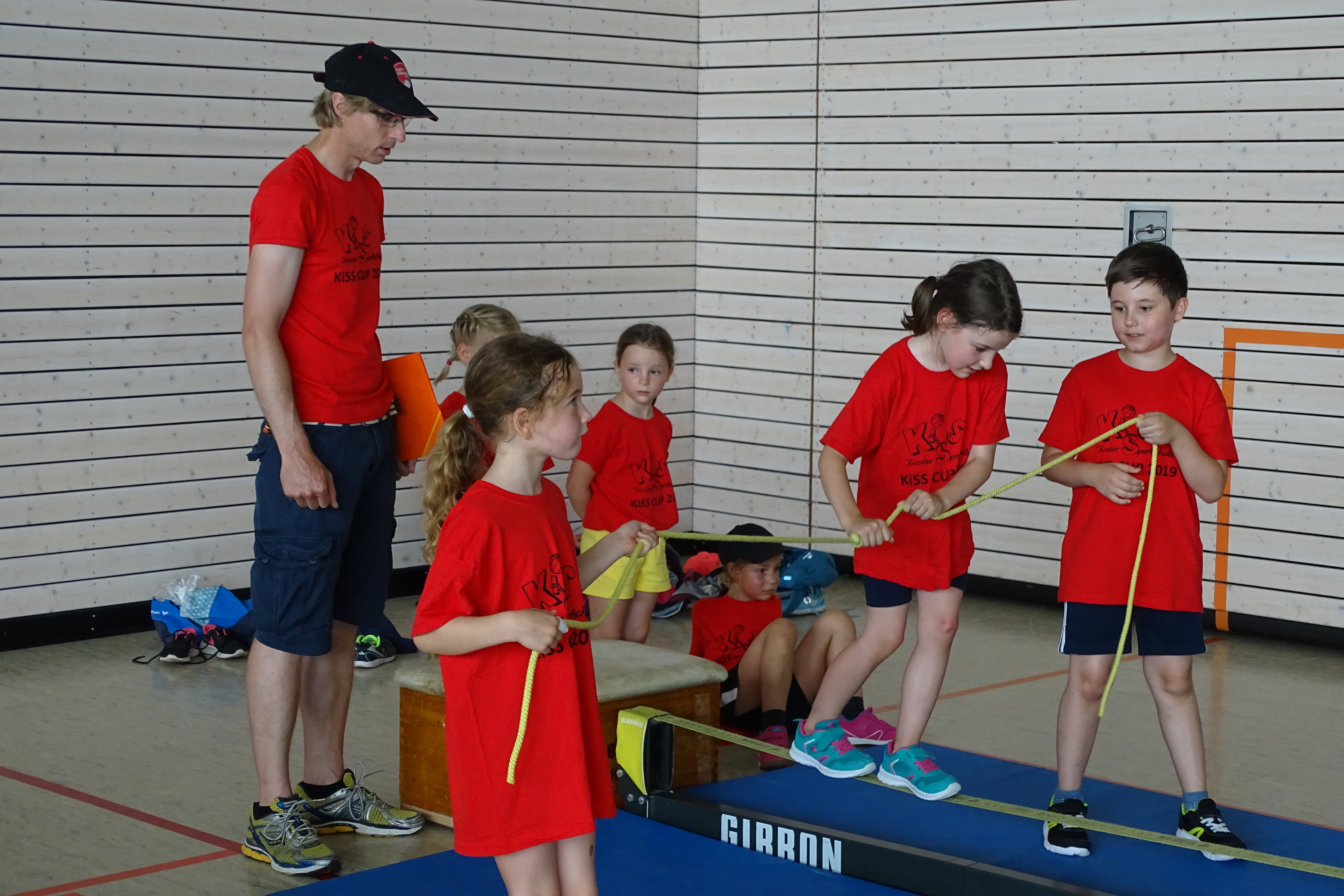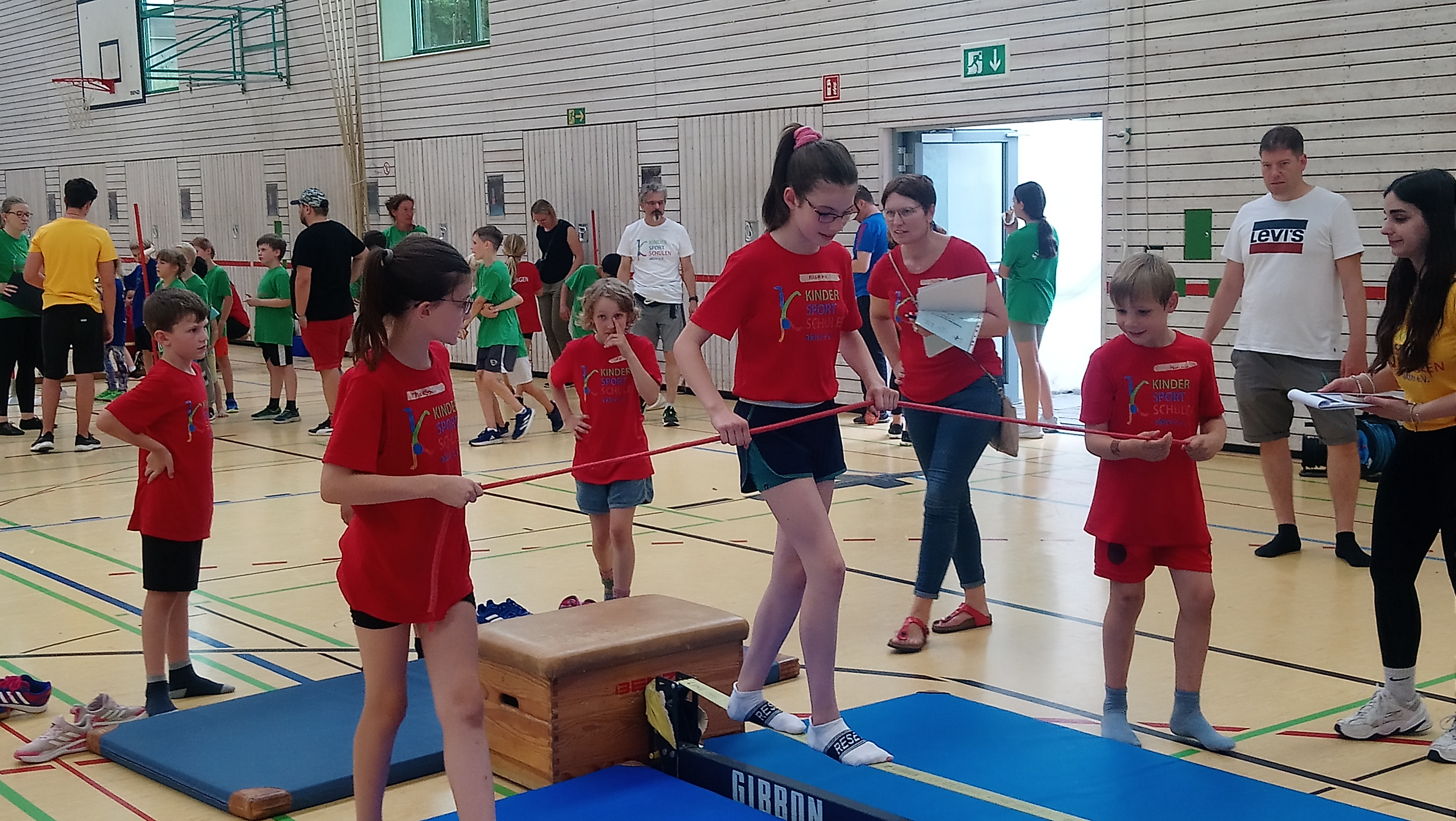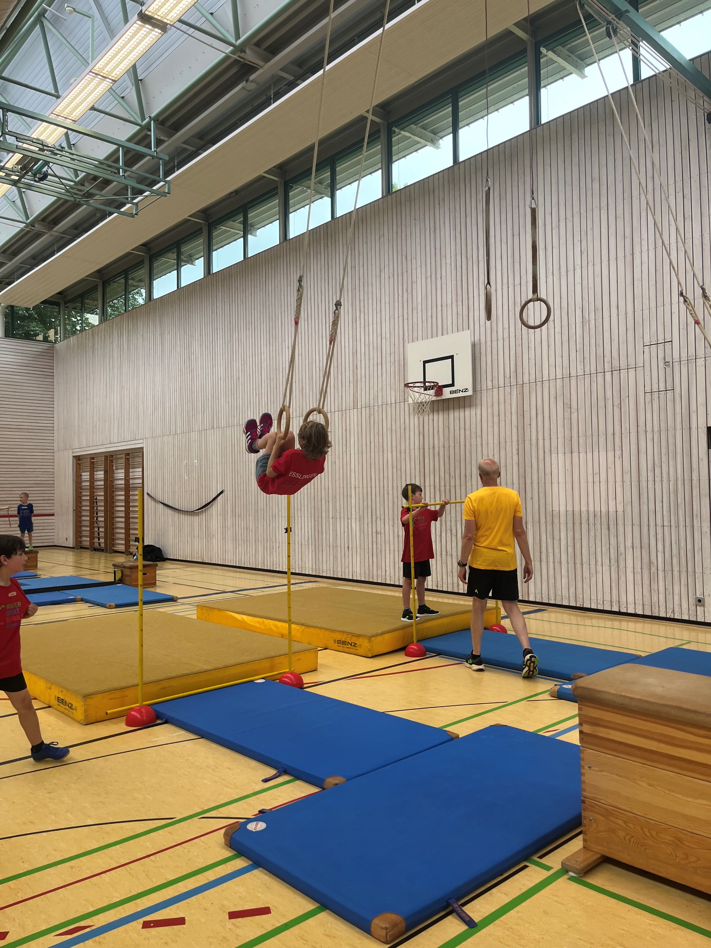 Schwingen mit Ringen über ein Hindernis, Erklimmen eines Mattenbergs, Turnen am Boden, Rhythmisierungsläufe, ein Hüpfdiktat, ein Ballparcours, Trampolinspringen, Balancieren über die Slackline.. viele verschiedene Aufgaben waren zu absolvieren.